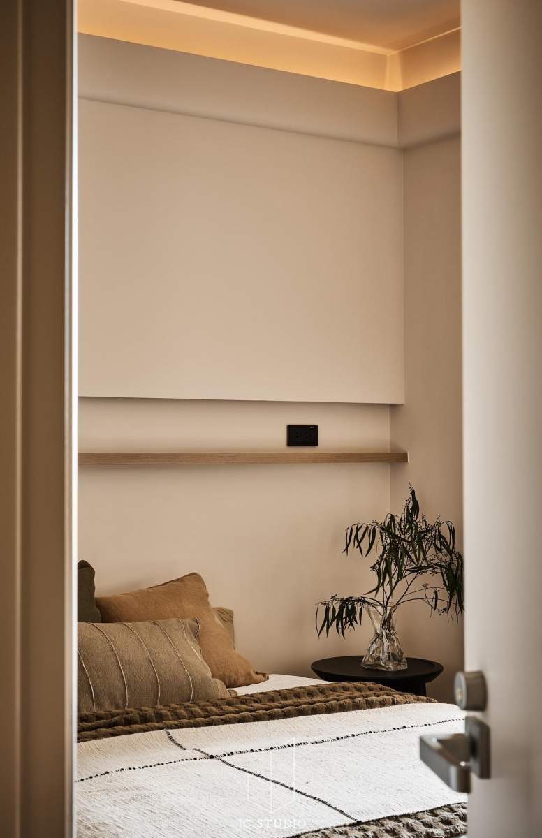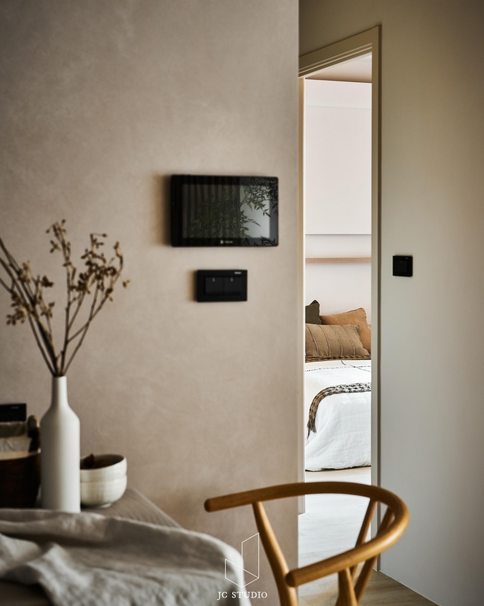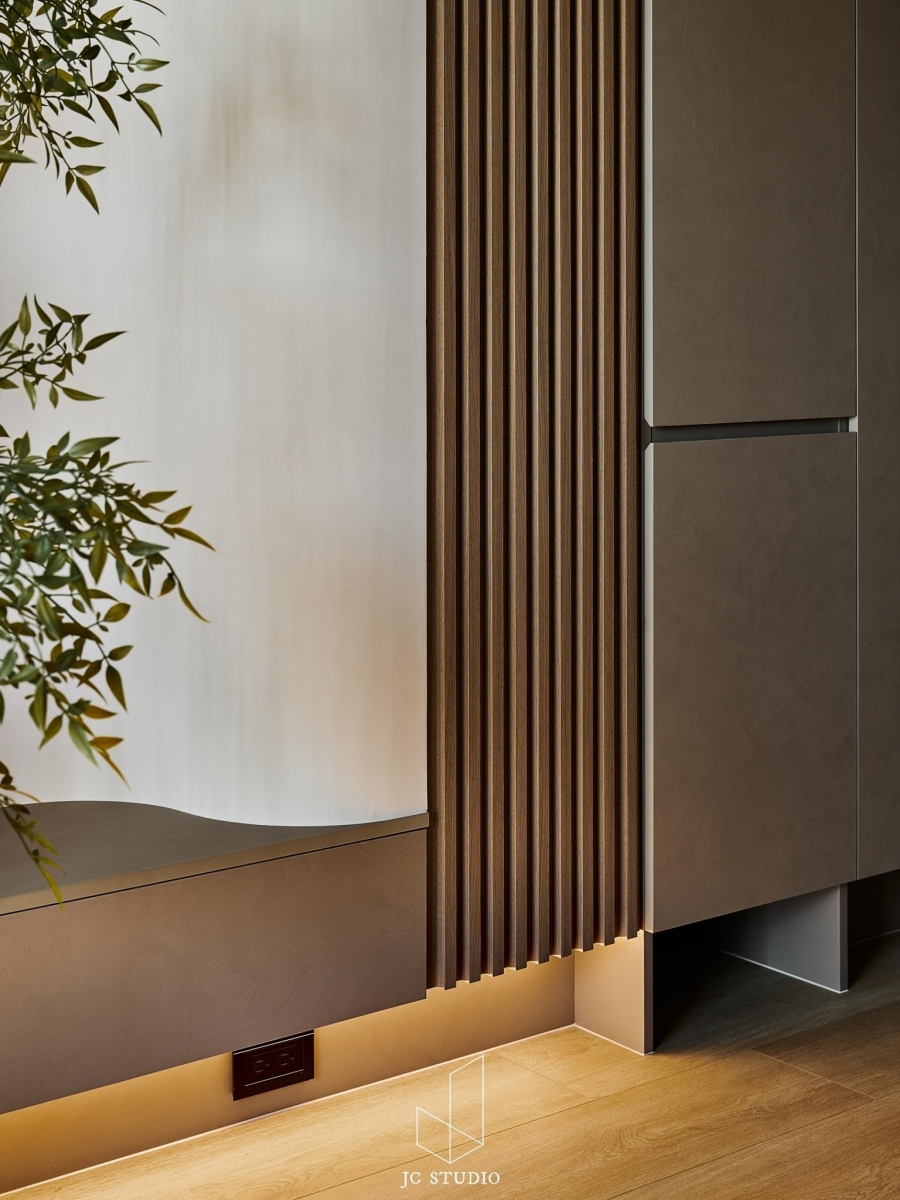 『桴嶼』柔桴圓潤,微光沐影,光線透過輕紗灑在木質調的地板上,直線排列的木紋、植栽的綠意,柔和靜謐的色調,燈光的氛圍,彷彿置身海島飯店,遠離城市的喧囂....._此案更動了原本的2+1房配置,狹長的開放空間以融合背牆的方式將客餐廳區做整合;此外,我們變更了主臥室的深度,滿足了女主人心念的更衣室收納,並利用大量的圓角收邊使天花板的層次更加柔和,全室以深淺不同的奶茶色系營造柔和且浪漫的氛圍。