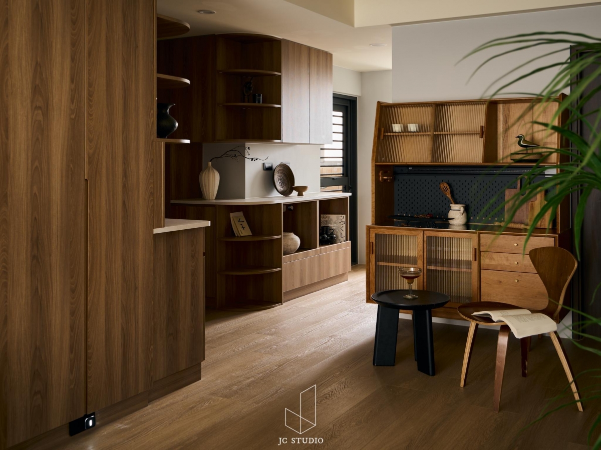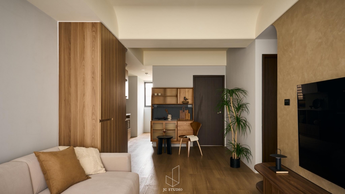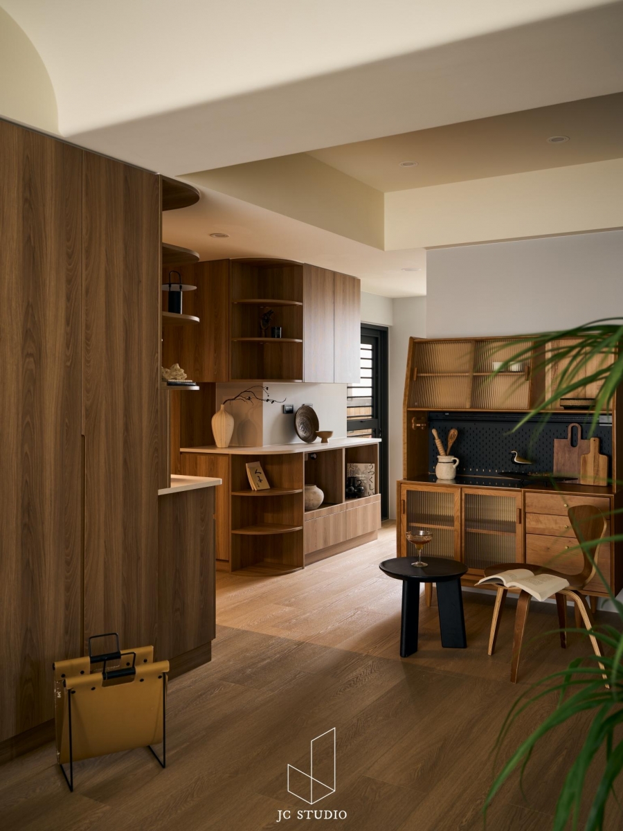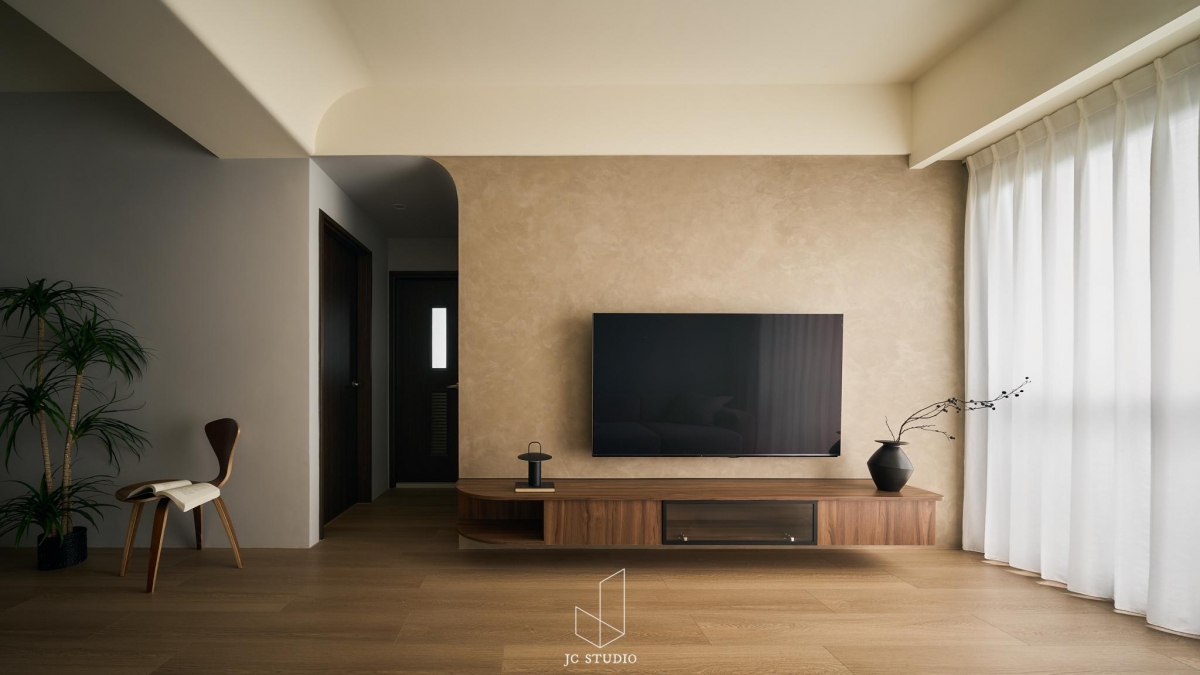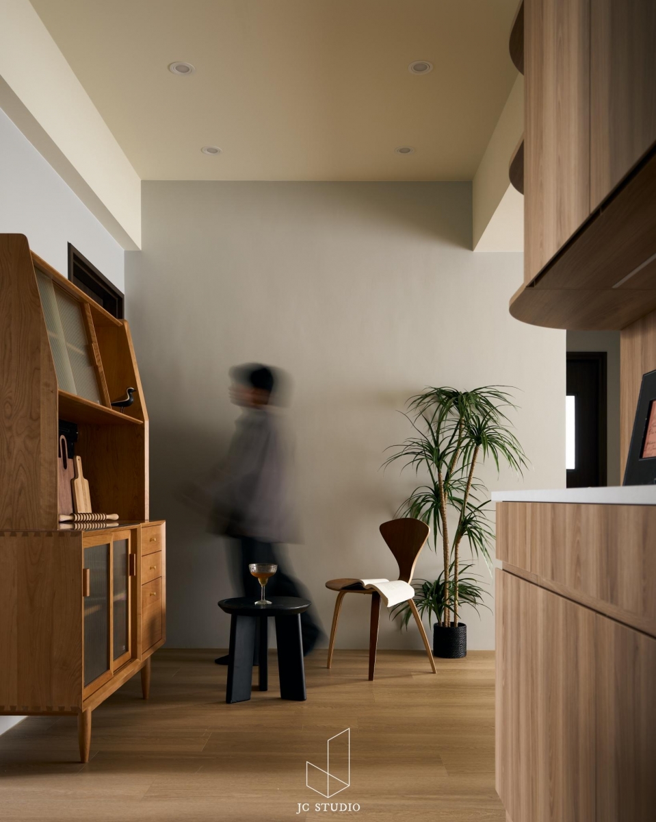 『森之隅』有時候,家的靜好不是來自多麼驚豔的設計,而是剛剛好的光影、質地與留白。融合屋主夫妻的喜好,在這個空間裡,我們讓木紋與米灰對話,讓光線不語地流動,回應居住者真正想安放的——是舒適、是秩序,也是生活的溫度。◆主臥室:「留白的房間,收納疲憊的心。」細膩的色階與自然材質堆疊出安定感,不多不少,剛好是可以好好入睡的溫柔。◆客廳電視牆「靜靜佇立的日常風景。」選用低調灰米調塗料,搭配溫潤木質,把視覺留下給陽光、把焦點還給生活。◆餐廚與收納區「讓生活,在角落裡發光。」實用的收納,溫潤的材質,每一道線條與層次,都是與生活共存的設計語言。