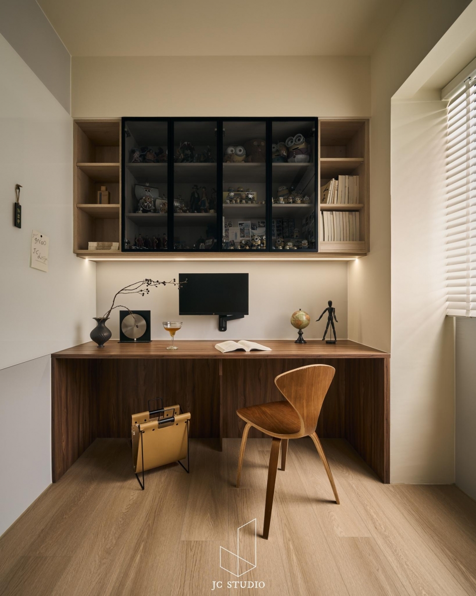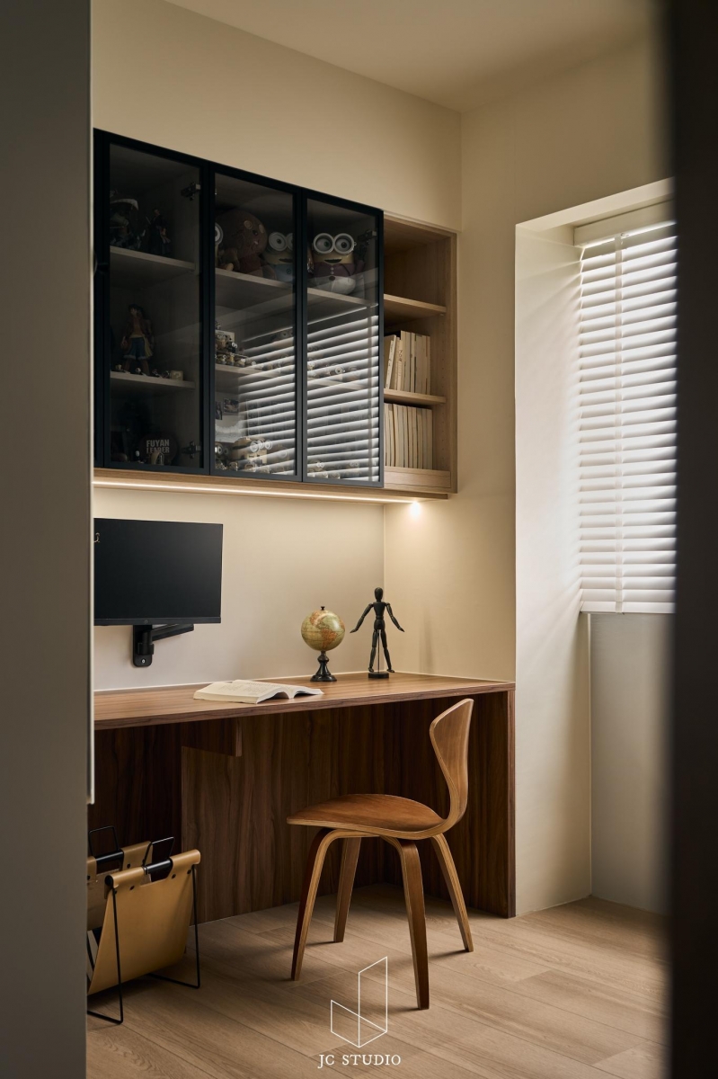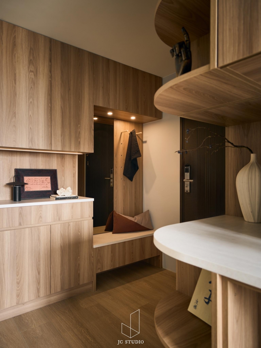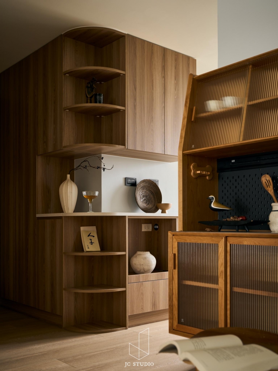 『森之隅』有時候,家的靜好不是來自多麼驚豔的設計,而是剛剛好的光影、質地與留白。融合屋主夫妻的喜好,在這個空間裡,我們讓木紋與米灰對話,讓光線不語地流動,回應居住者真正想安放的——是舒適、是秩序,也是生活的溫度。◆主臥室:「留白的房間,收納疲憊的心。」細膩的色階與自然材質堆疊出安定感,不多不少,剛好是可以好好入睡的溫柔。◆客廳電視牆「靜靜佇立的日常風景。」選用低調灰米調塗料,搭配溫潤木質,把視覺留下給陽光、把焦點還給生活。◆餐廚與收納區「讓生活,在角落裡發光。」實用的收納,溫潤的材質,每一道線條與層次,都是與生活共存的設計語言。